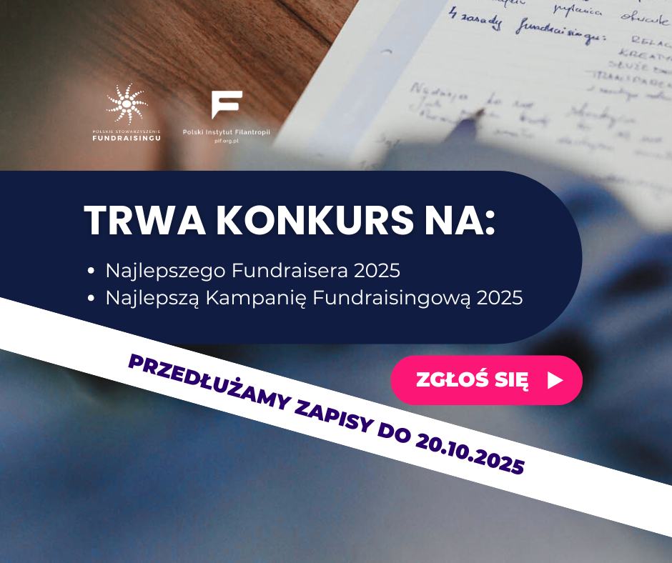 Ze względu na liczne zapytania i duże zainteresowanie środowiska NGO, Polskie Stowarzyszenie Fundraisingu przedłuża termin przyjmowania zgłoszeń w Konkursie do poniedziałku, 20 października 2025 roku włącznie.